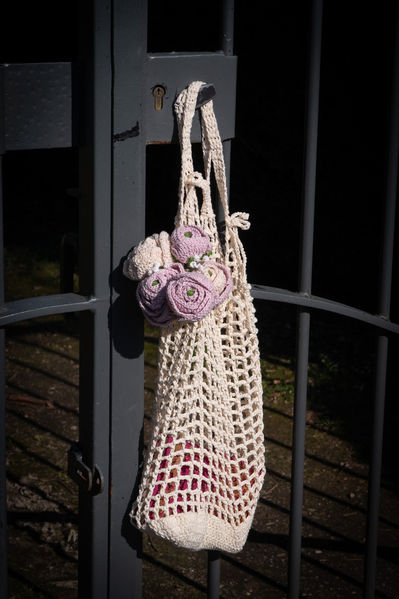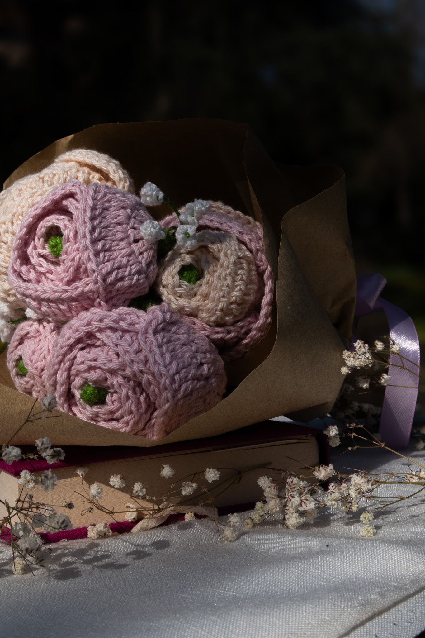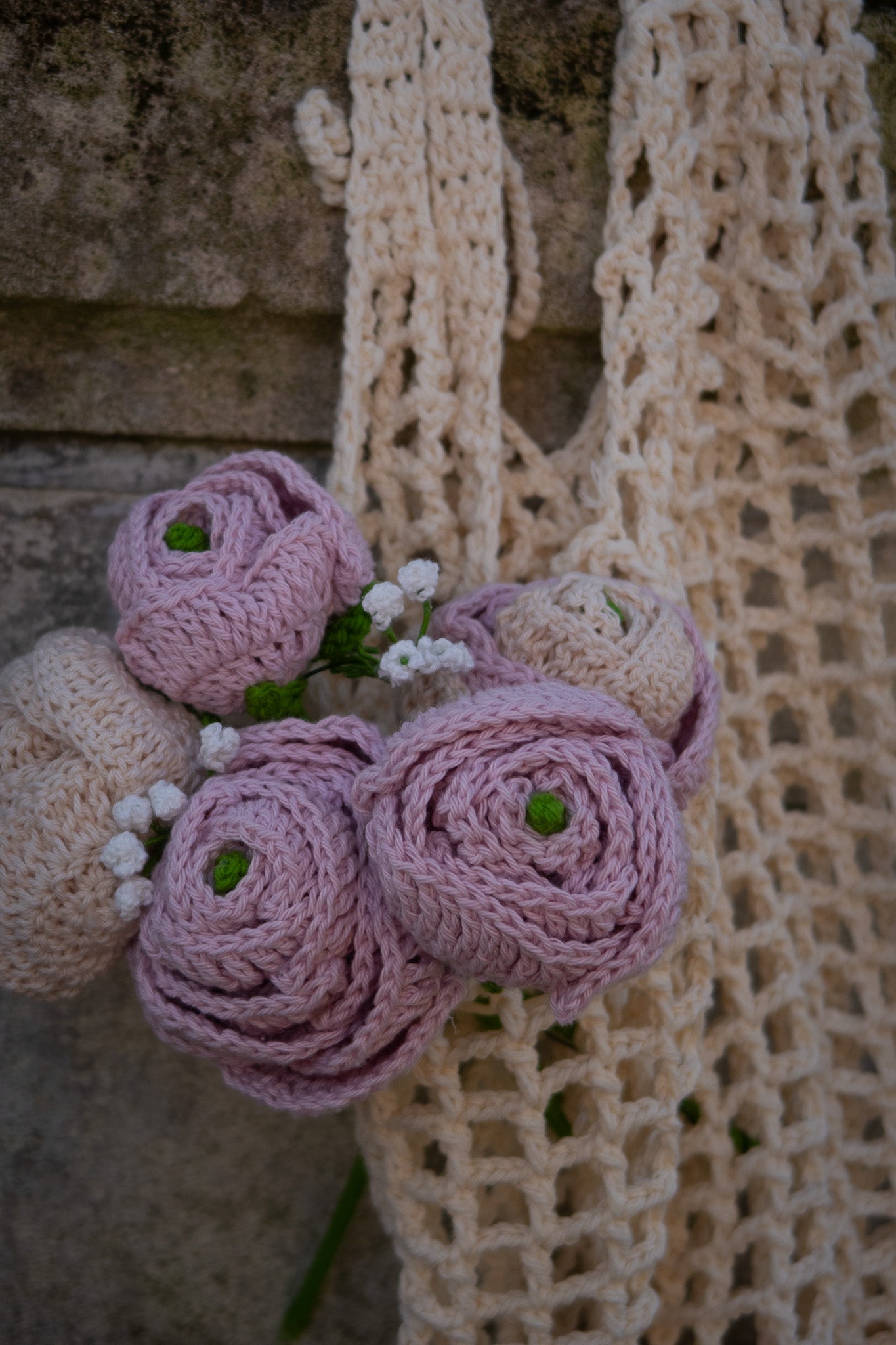 Bouquet de renoncules confectionné au crochet. Chaque bouquet est unique car préparé à la main maille après maille. Du gypsophile vient sublimer le bouquet.